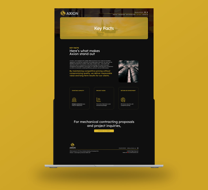 Axion Infratech is a licensed mechanical contracting company operating in the Kingdom of Saudi Arabia, specializing in providing end-to-end mechanical solutions for oil & gas, petrochemical, power, and infrastructure projects.